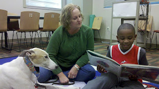 Our very first visit was March 19th. Lucky for us, our entire hour was filled with appointments made by four children. The first to read to Lucy was a little boy named Varun. He is from India, I believe, and if there was ever a very animated and enthusiastic reader, this is Varun. It was quite comical but you could tell he loved to read and loved reading to Lucy. After Varun was done, a little boy from Africa read to Lucy. He had a bit more difficulty but he did pretty well for a child his age. The book he chose was a difficult one, I think. Next time, we'll get one that is a bit easier for him. Then a Mexican girl read to Lucy. She was a really good reader. By this time, the hound in Lucy had come out and she was sprawled out on the blanket fast asleep. I told the children that Lucy was listening and was just resting her eyes. The last child was the best friend of the first Mexican girl. She also was an excellent reader. I believe three of these children have signed up for every session until June or so and we will be there two Saturdays a month. Whoo hoo!!